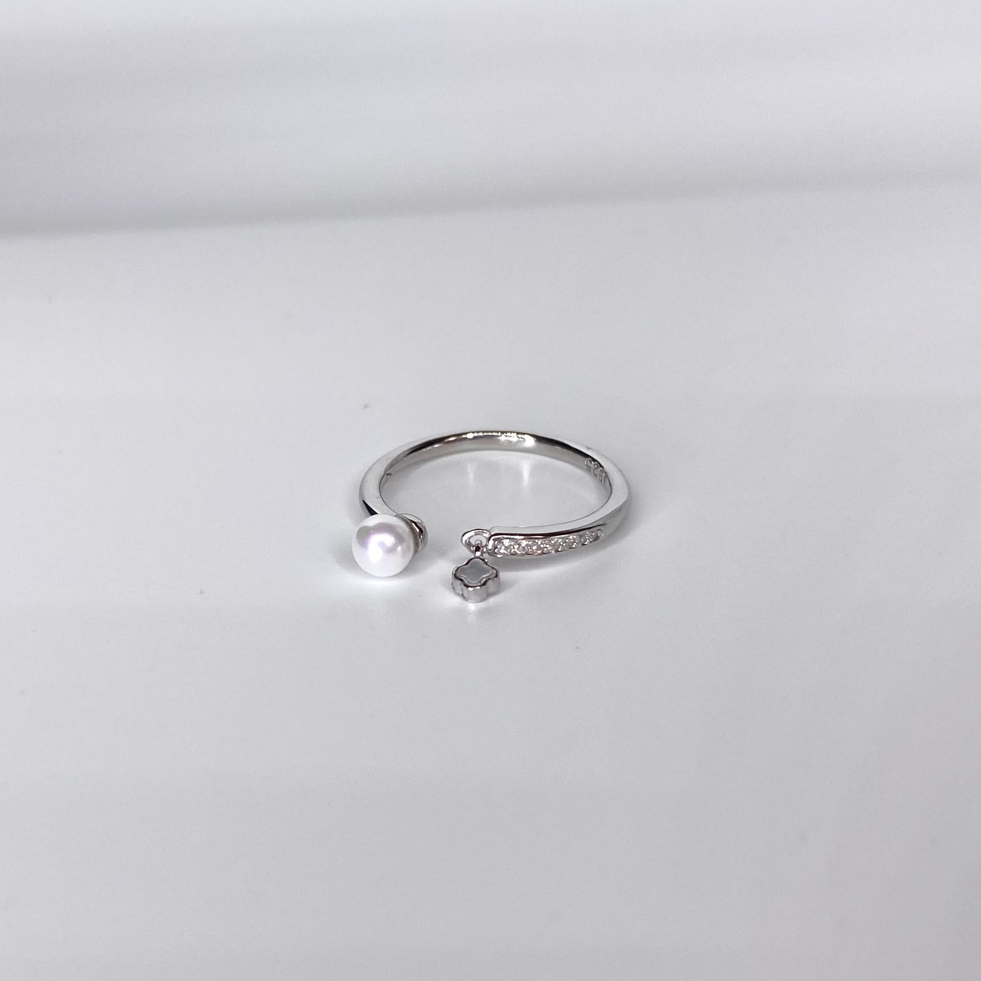 Inel reglabil cu perla si trifoi atarnator. Inelul este confectionat din argint 925 si este accesorizat cu zirconii albe.