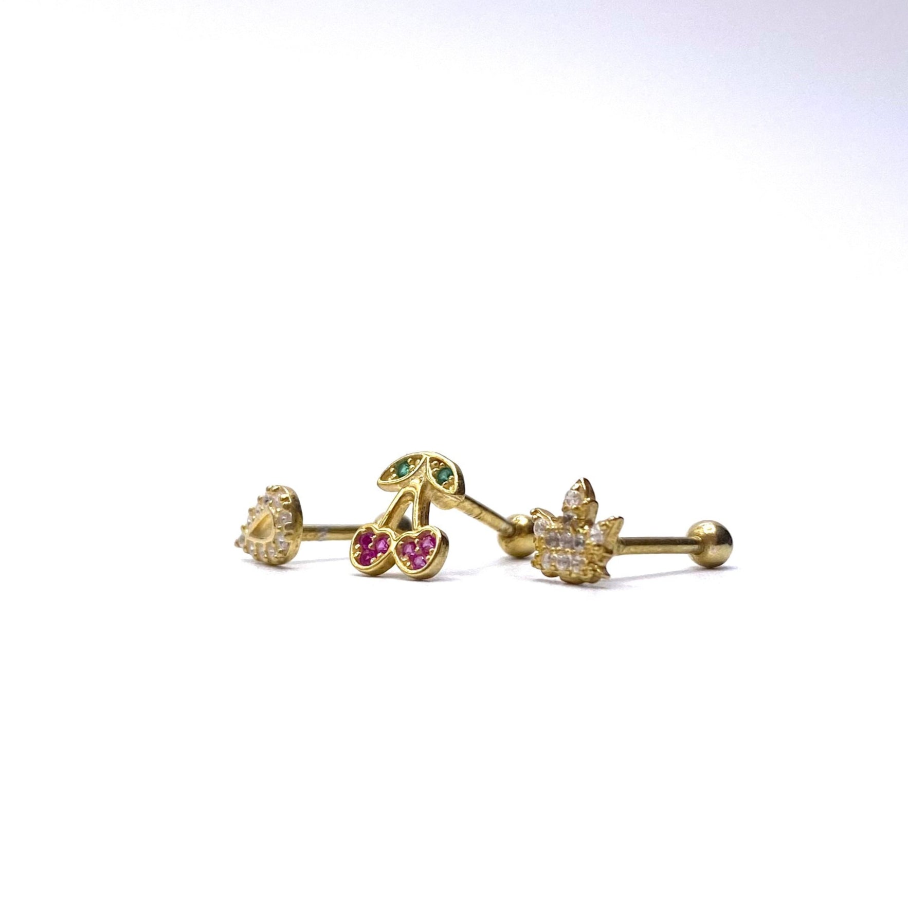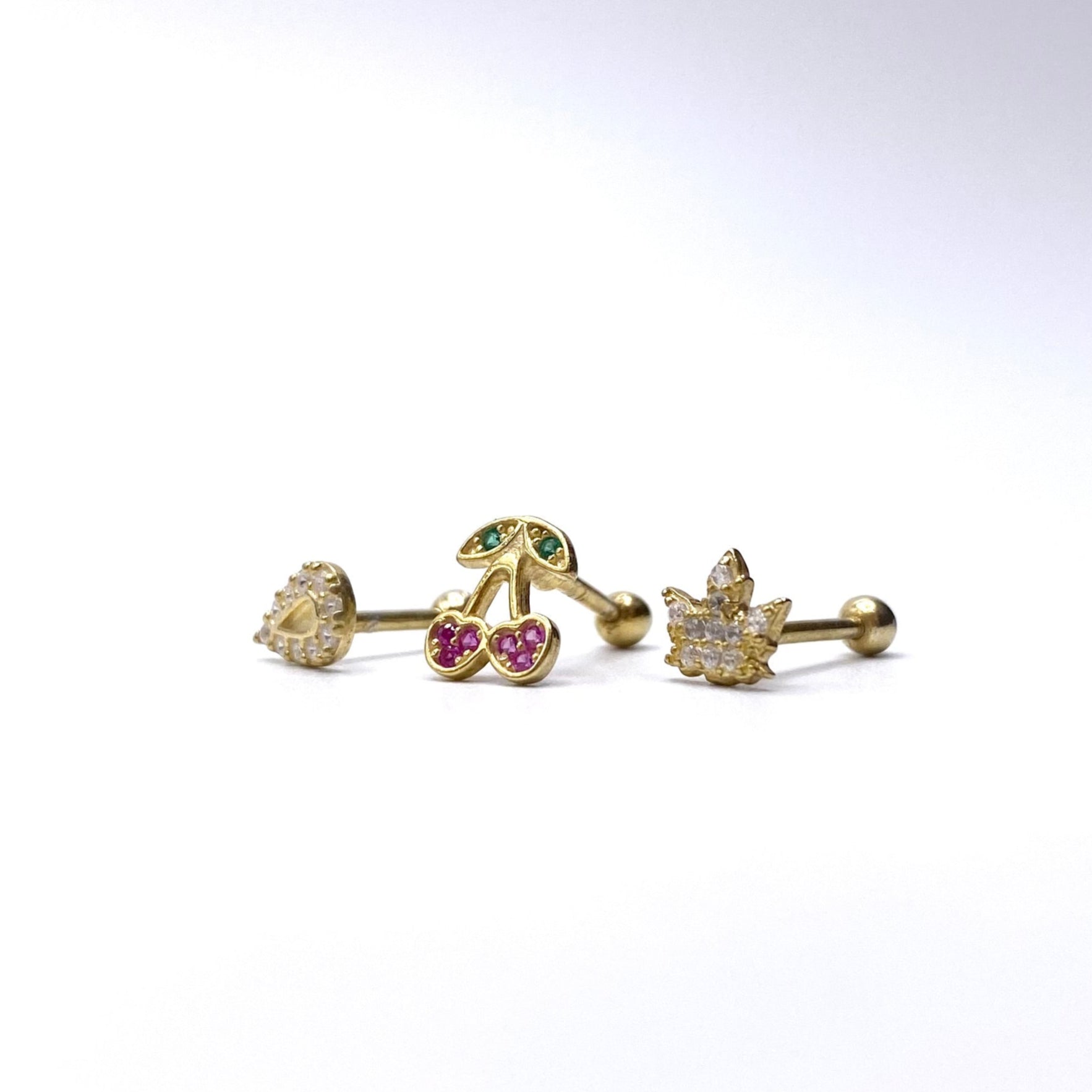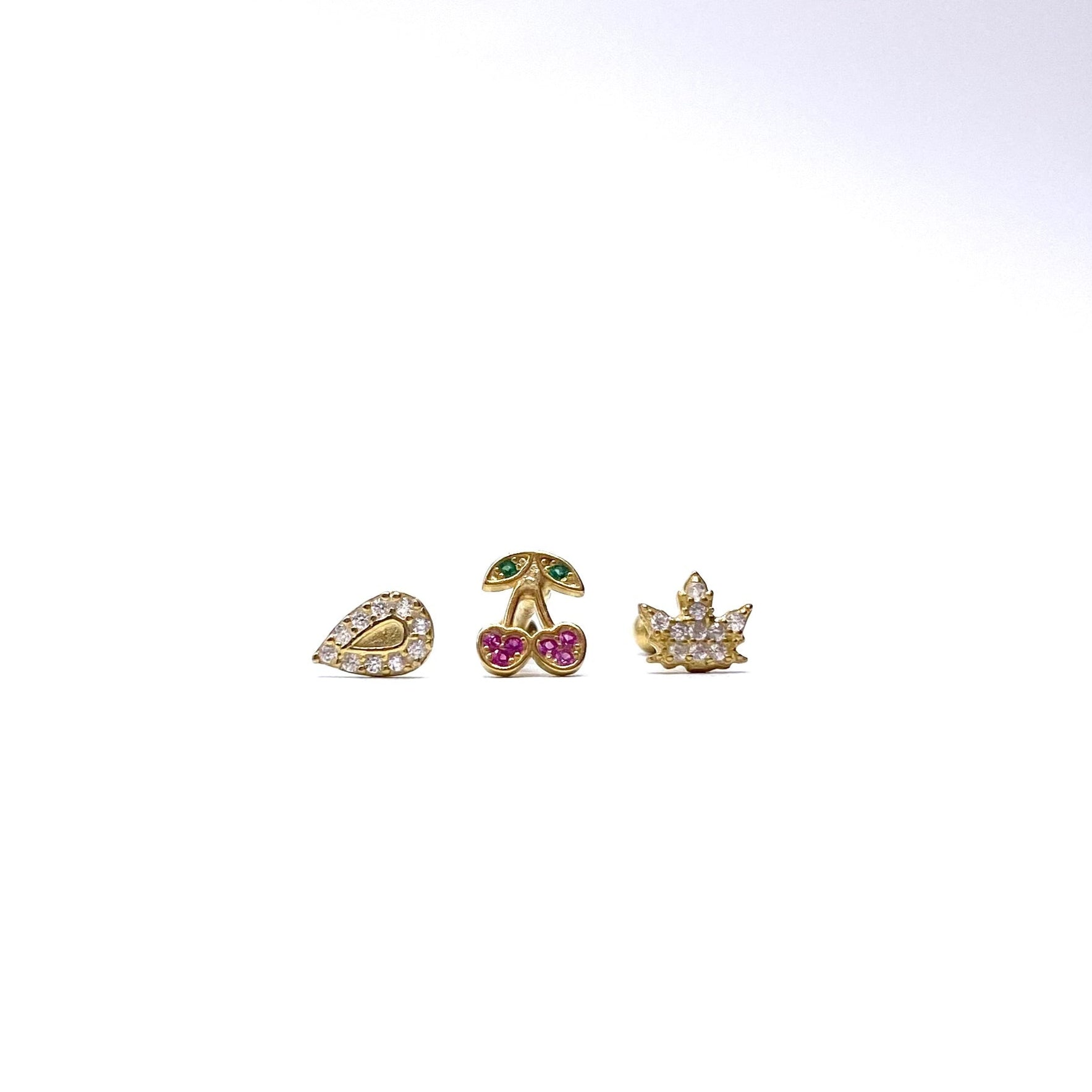Set 3 cercei piercing (picatura, cirese, coronita) din argint 925 suflat cu aur. Sistemul de inchidere este prin insurubare.